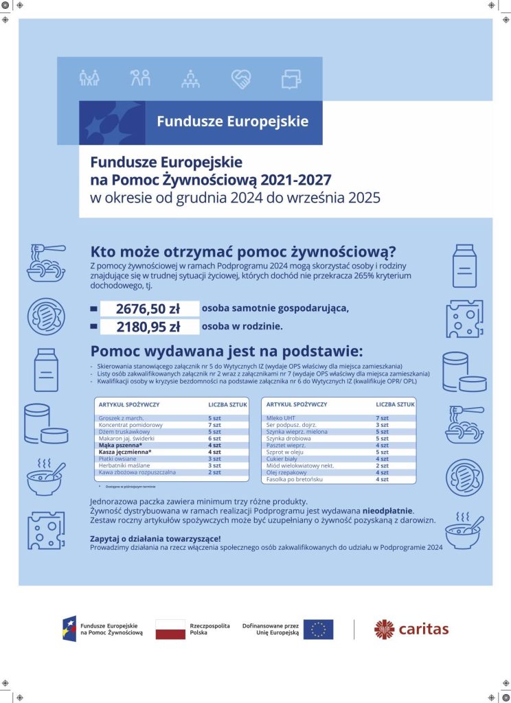 „Caritas Archidiecezji Szczecińsko-Kamieńskiej jest jedną z 28 Organizacji Partnerskich Regionalnych (OPR), które we współpracy z Caritas Polska (OPO), odpowiadają za realizację dystrybucji artykułów spożywczych i prowadzenie działań towarzyszących w ramach Programu Fundusze Europejskie na Pomoc Żywnościową 2021-2027 współfinasowanego z Europejskiego Funduszu Społecznego Plus. W ramach Podprogramu 2024 (realizowanego w roku 2025) OPR planuje dystrybucję żywności dla ok. 11.500 osób. Caritas Archidiecezji Szczecińsko-Kamieńskiej przeprowadzi minimum 52 działania towarzyszące dla ok. 1200 osób objętych pomocą żywnościową.